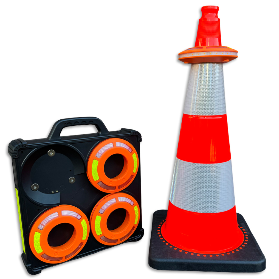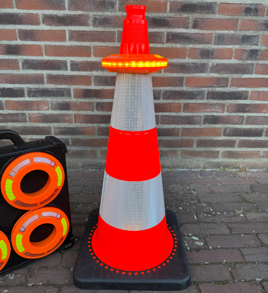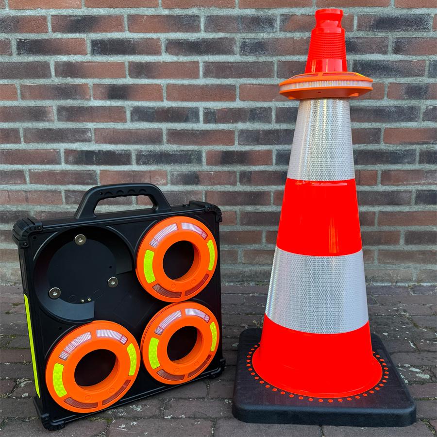 We have developed smart Traffic Cone LED flares to warn road users on time and over a great distance of calamities, vehicles with breakdowns or road works. These LED flares are visible over a great distance and provide perfect traffic management thanks to sequential (sequential) lighting. Take this unique patented emergency lighting out of the holder and place it on the road or on a vehicle using the the built-in magnets. The lighting starts automatically thanks to new sequencing technology in a so-called MESH network. In this network, all smart flares are equal. Each flare works independently and with the push of a button different lighting patterns can be selected that are automatically taken over by the other flares.