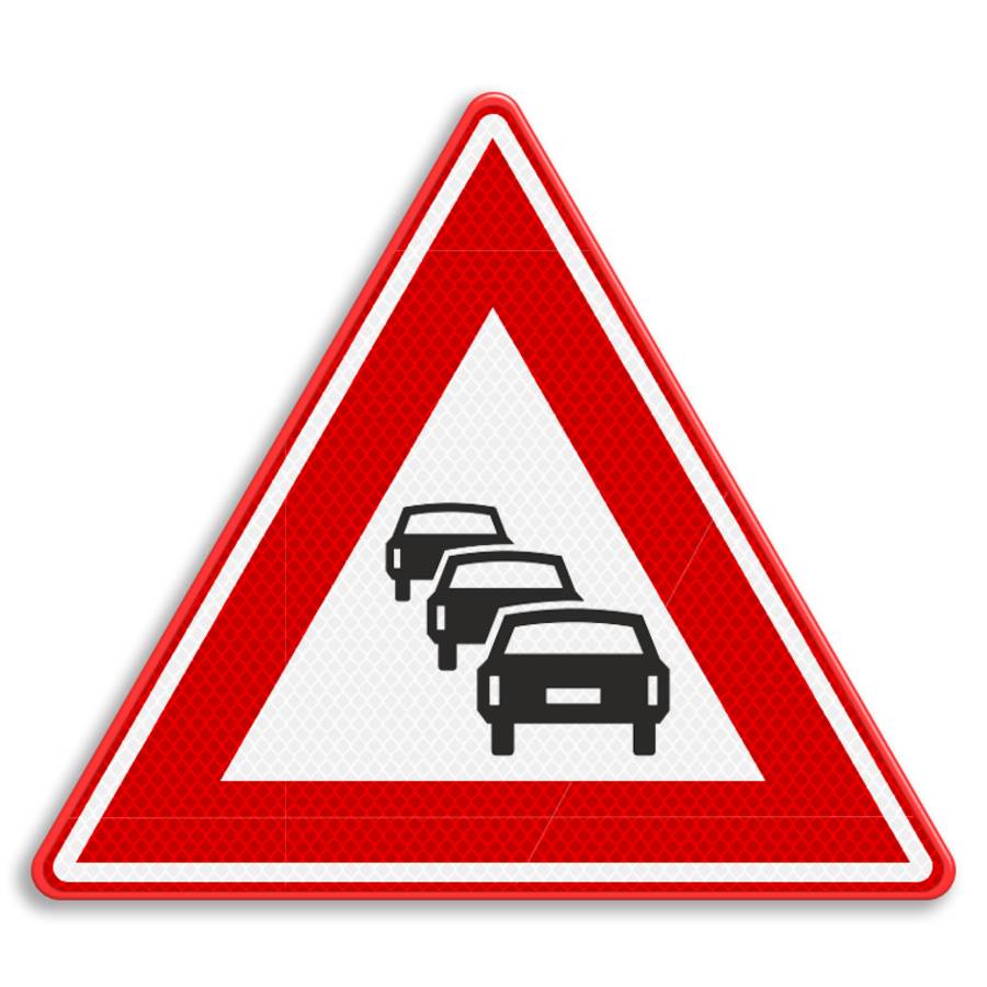 Official RVV J33 traffic sign warns of an increased risk of traffic jams. After passing this indication, road users know that they are entering a zone where traffic jams occur with some regularity.